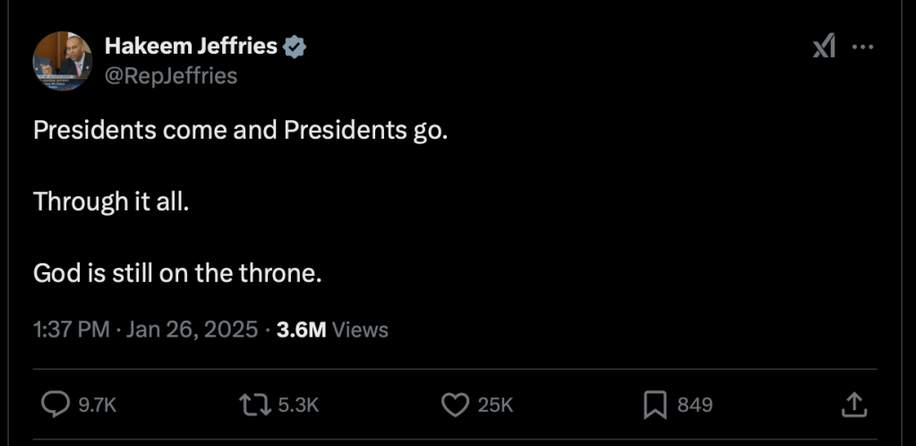 Then on Sunday, the minority leader of the House of Representatives, Hakeem Jeffries, posted on the site formerly known as Twitter, using his official House account, this: