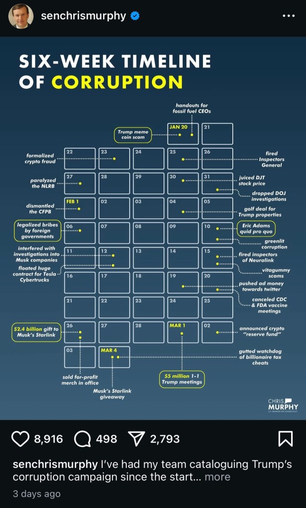 “In the first six weeks of the Trump presidency, Trump and Elon Musk and their billionaire friends have engaged in a stunning rampage of open public corruption,” Murphy said.